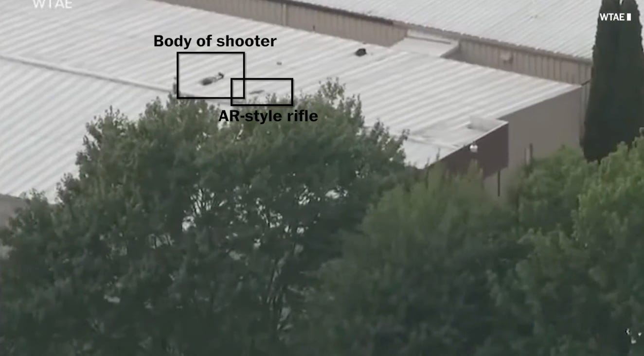 《华盛顿邮报》验证的航拍镜头显示,他的尸体位于建筑物东侧约 40 英尺处,可以看到停车场。离他几英尺远处有一支步枪,屋顶更远处有一个看起来像袋子的物体。