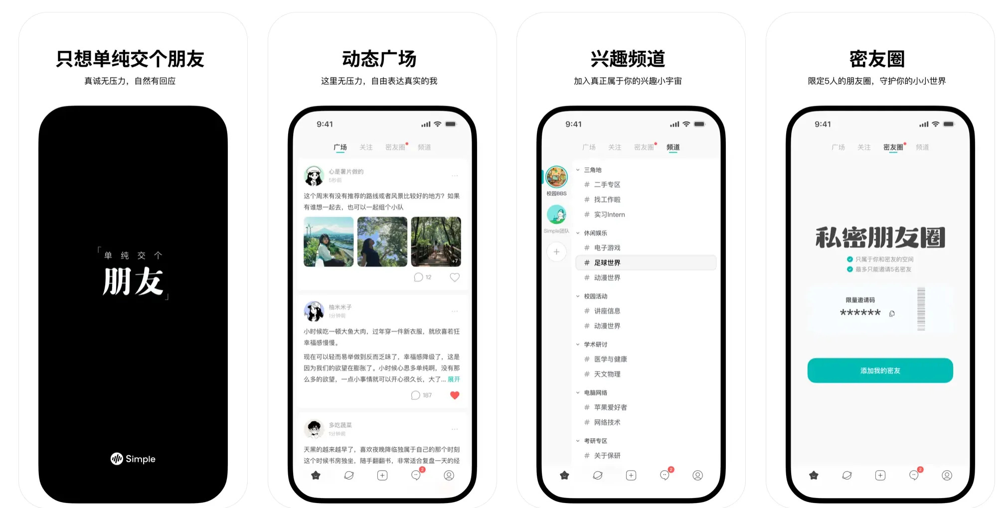 最近发现了一款很特别的社交软件 Simple,它的理念很简单 - 就是"只交朋友,不谈恋爱"。在这个充满功利性的社交环境里,我觉得这样的定位挺独特的,它试图打造一个没有压力、可以真诚交流的空间。看得出来创始团队是真的思考过现代社交的痛点,想通过纯粹的产品设计帮我们找回社交最本真的样子。