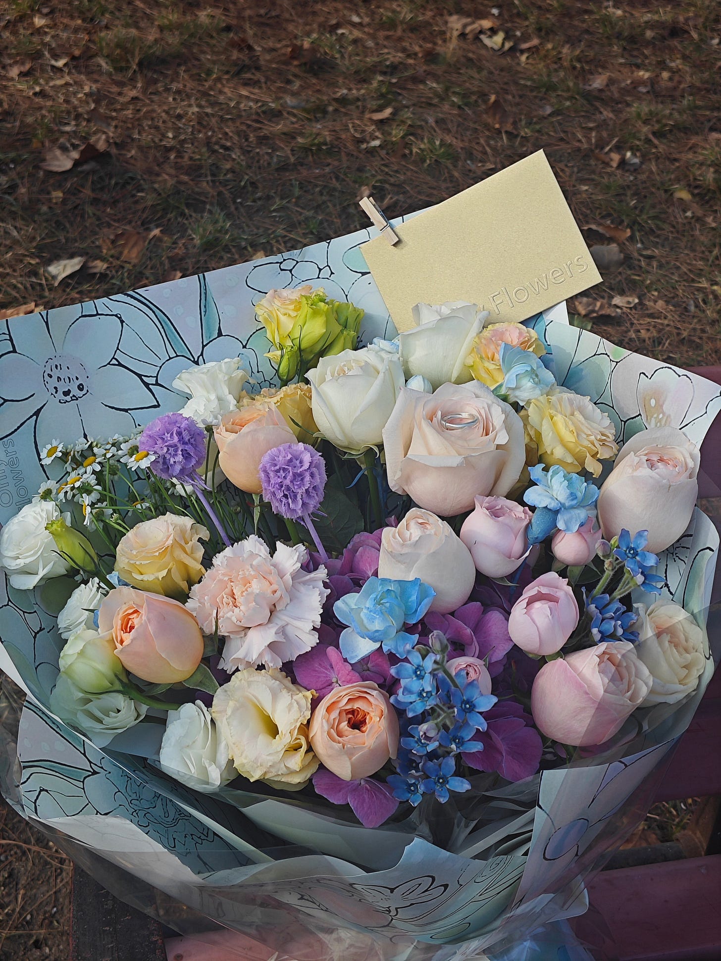 所以,第一,这件物品需要符合我的审美。第二,细节上,需要有「我们」的特点。我终于找到了一家北京的连锁花店,商品展示的鲜花搭配具有艺术气息,产品详情页展示的花束包装也十分精美,客服按照我的需求推荐了几款鲜花搭配。我最终选择的鲜花含有我非常喜欢的紫色,我也希望小冰收到鲜花的时候,多彩的颜色,能缓解她在北京枯燥冬天的那种疲劳感。最后,我特意在贺卡上写了一段寄语,传达我的心意。