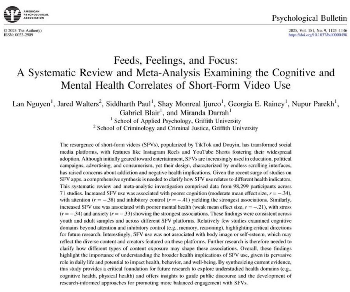 Nguyen, L., Walters, J., Paul, S., Monreal Ijurco, S., Rainey, G. E., Parekh, N., Blair, G., & Darrah, M. (2025). Feeds, feelings, and focus: A systematic review and meta-analysis examining the cognitive and mental health correlates of short-form video use. Psychological Bulletin, 151(9), 1125–1146.