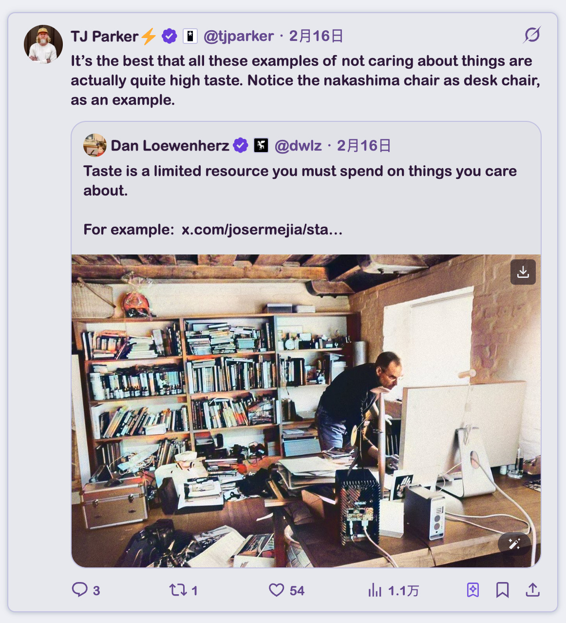 这是品味在吞噬自身。一把中岛胜寿的椅子被当作办公椅。上次查的时候大约三千美元,由一位为了彻底隔绝和极致精进而搬到宾夕法尼亚州腹地的木工大师设计。一个在 MIT 求学、在东京跟随安东宁·雷蒙德学徒、二战期间被关押在米尼多卡拘留营并在营中制作家具的人——他的作品被当作背景道具,用来表演一种「不在意」。照片中的那个人并非漫不经心。他在以相当昂贵的代价表演漫不经心。