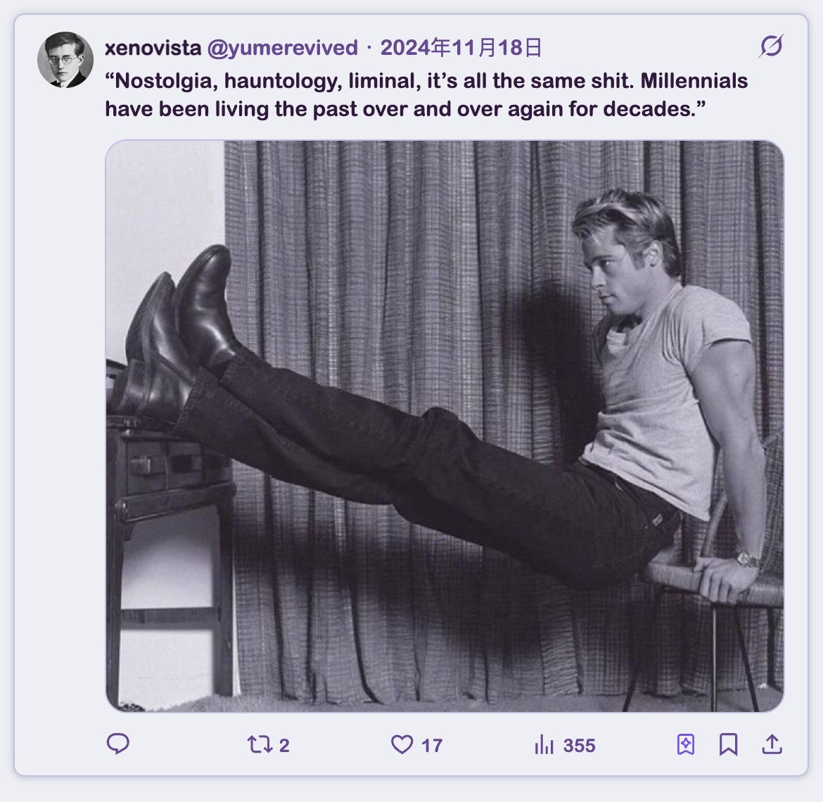怀旧,幽灵学,阈限空间——都是一回事。千禧一代已经把过去反复活了几十年了。