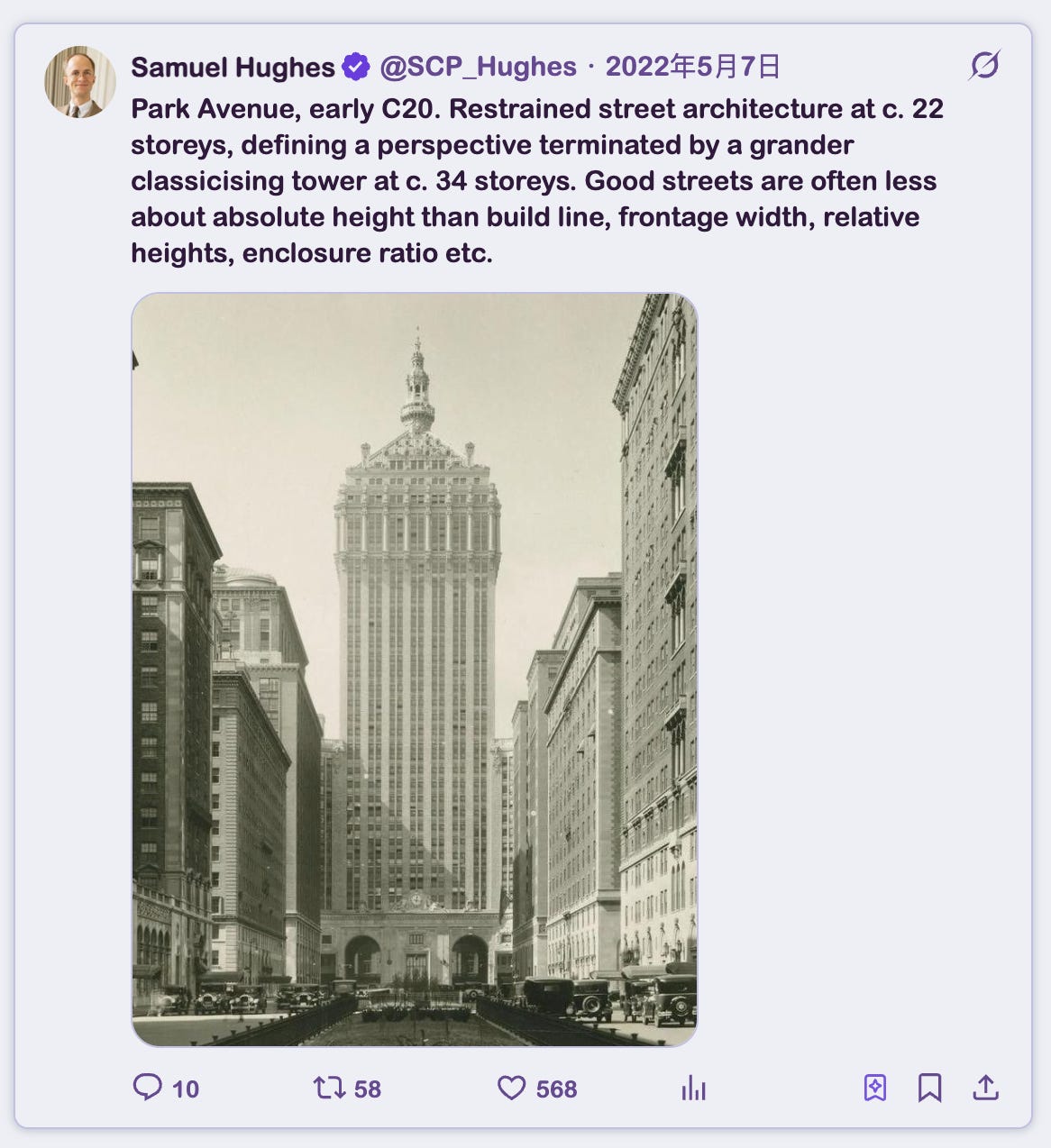 公园大道,二十世纪初。约 22 层的克制街道建筑,勾勒出一条透视线,终止于一座约 34 层的更宏伟的古典主义塔楼。好的街道往往不在于绝对高度,而在于建筑红线、立面宽度、相对高度、围合比等等。