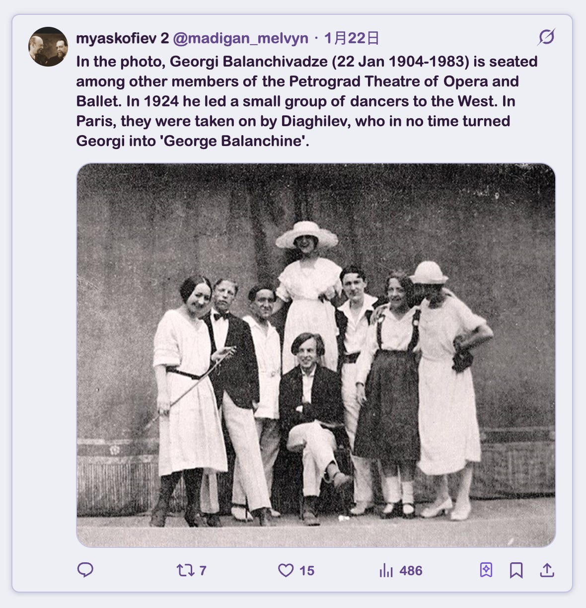 照片中,格奥尔基·巴兰奇瓦泽(1904 年 1 月 22 日 - 1983 年)坐在彼得格勒歌剧与芭蕾舞剧院的其他成员之间。1924 年,他带领一小群舞者出走西方。在巴黎,他们被迪亚吉列夫收入麾下,后者很快将格奥尔基变成了「乔治·巴兰钦」。