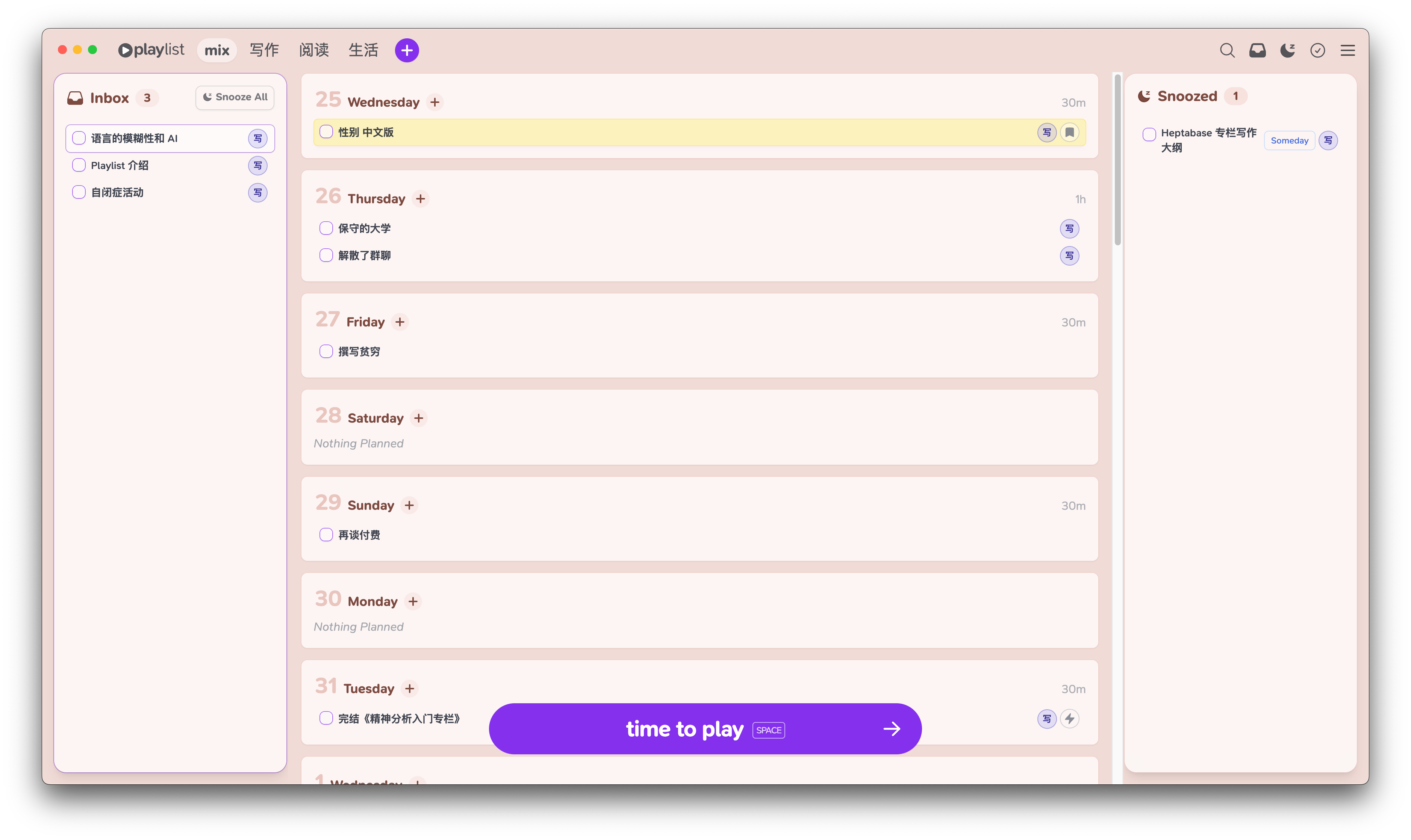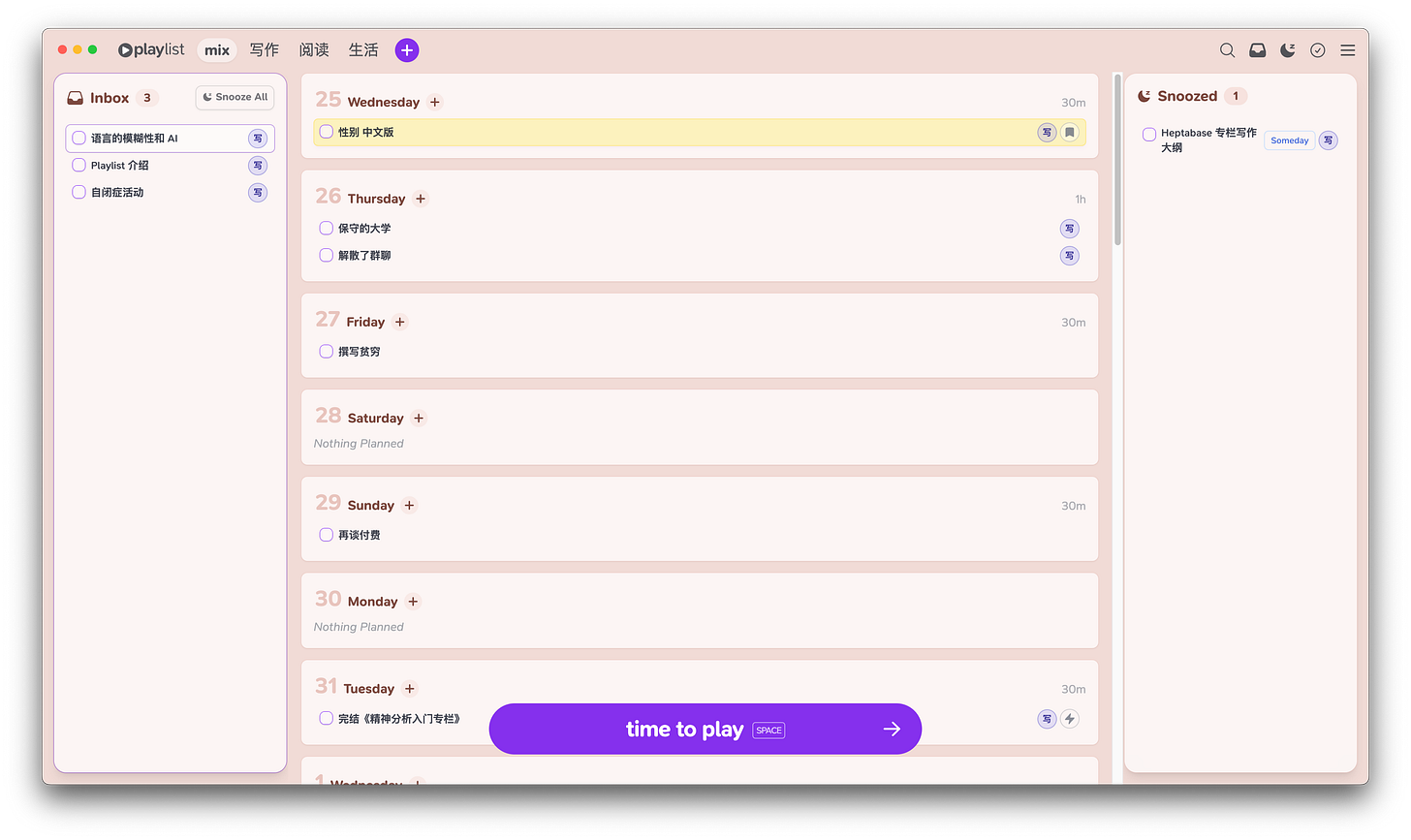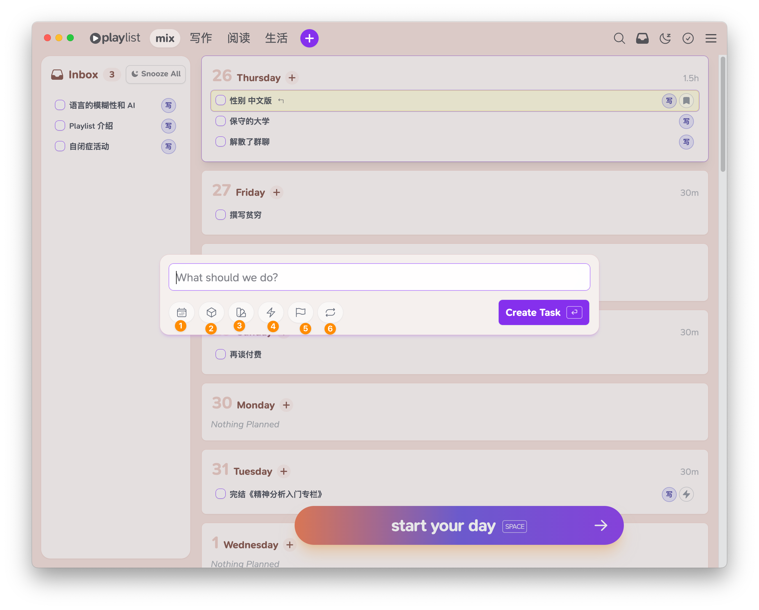 我特别喜欢安排「能量」的功能。还记得「心理能量」吗?对,libido。Playlist 帮助我们合理分配任务关注度和精力投入,有效防止过度疲劳,并提供评估任务处理方式的休息时间。例如,完成一项高耗能任务后,我们可以通过适当休息来恢复精力,从而更高效地完成后续任务。