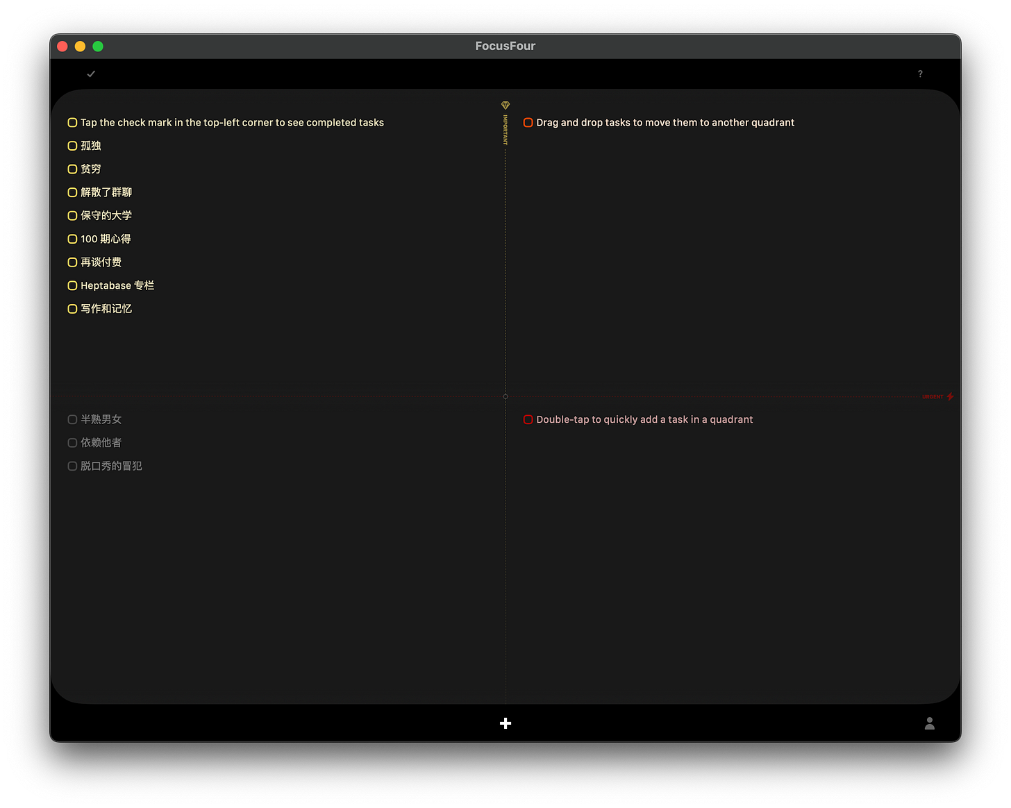 不过,体验上还是有一些小问题的。比如,所有的任务都被挤在了每个象限中。一旦每个象限中的任务堆叠,就会比较影响宏观地对任务的整体把控。这一点也许在 Mac 和 iPad 上得以解决,但仍然希望能够支持像一般的 Todo 软件给予iOS版一个瀑布流的方式,让我们浏览内容。另外,目前无法像 Todoist、Things3 等 Todo 软件可以创建 Project(项目)以及记录一些简单的,有关该任务的笔记。