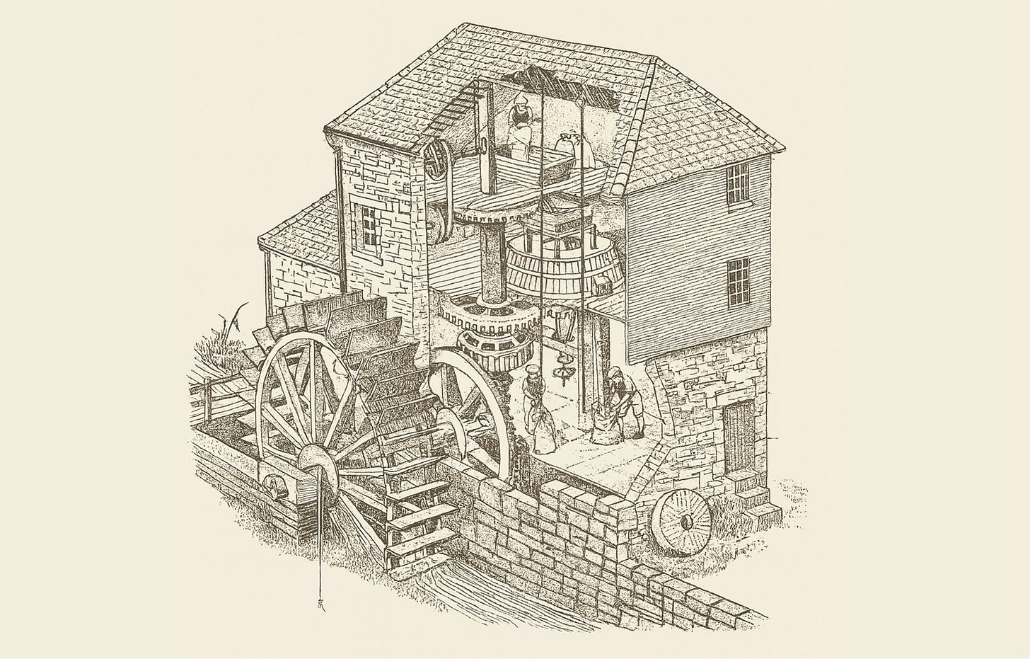 第二个故事关于蒸汽机。 在工业革命初期,早期的纺织工厂建在河流和溪流旁边,靠水车驱动。蒸汽机出现后,工厂主最初只是用蒸汽机替换了水车,其他一切照旧。生产力的提升并不显著。