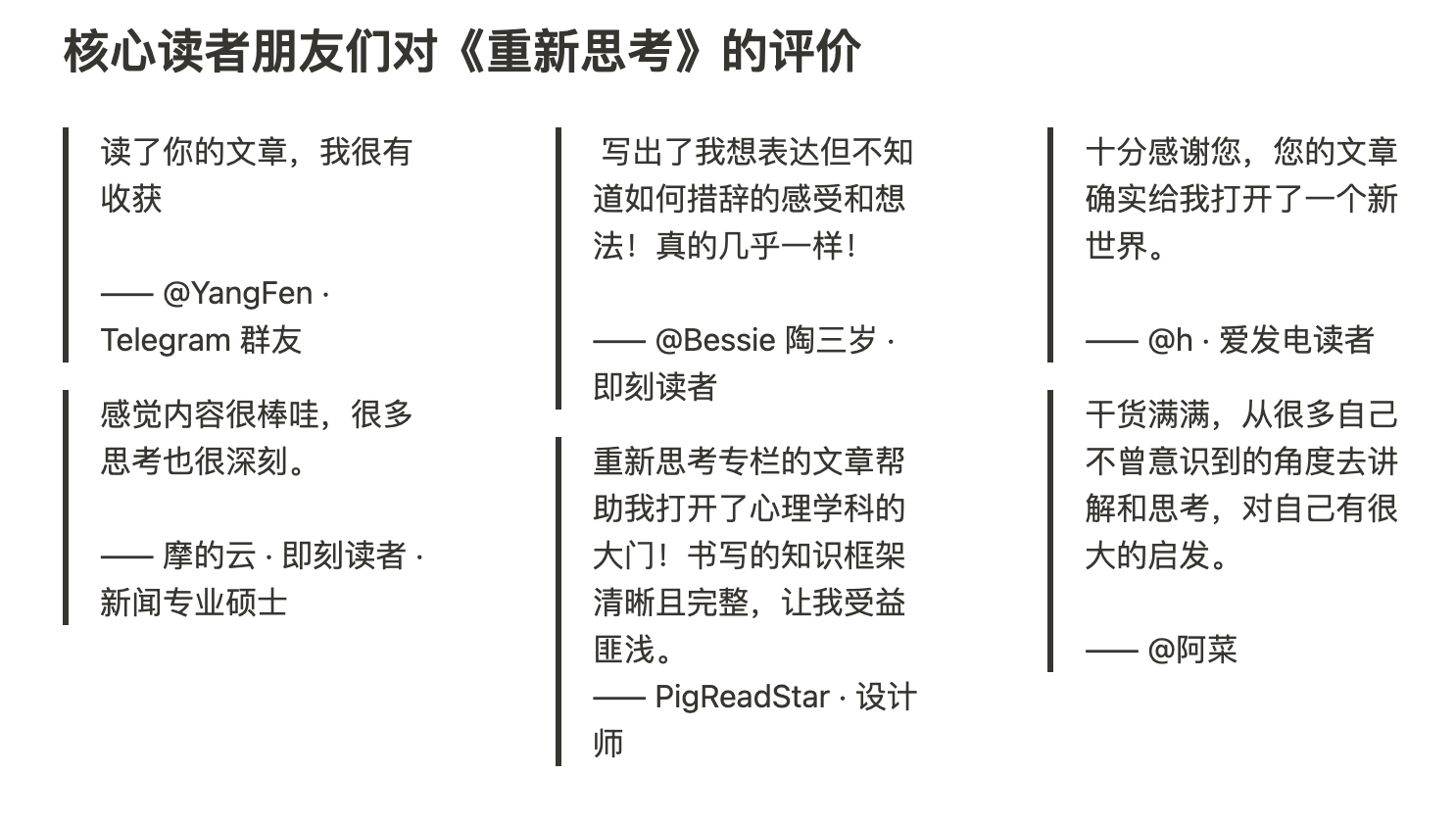 更新了 重新思考 Q&A。你可以点击链接查看,也可以在 Substack 的 About 中查看。更新之后,收获了 4 位忠实(付费)读者,现在一共 5 位。感谢大家的支持。