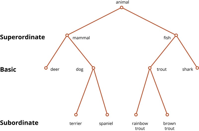 这三个层级是什么意思呢?对于大部分普通人来说,我们在日常生活中通常只用到 Superordinate 和 Basic 这两个层级去分类事物。