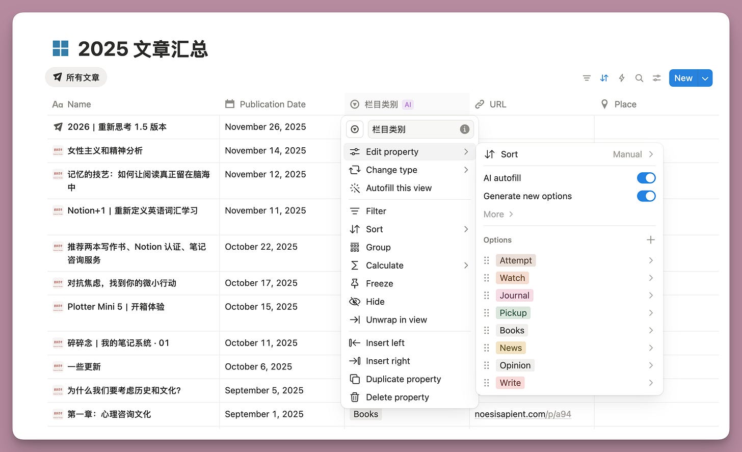 回到 Notion AI。2023 年,Notion 发布了首版 Notion AI——一个在你工作的地方帮助你工作的智能工具。那时它的能力还比较有限,行内 AI 的翻译、润色效果都比较一般。因此,最能发挥 AI 能力的地方是 Database 中的 AI Property,例如总结、关键词和自定义填充。在自定义填充(Custom Auto Fill)中,可以输入 AI 博主们分享的 Prompt,效果不错。我最常用的是总结和标签。