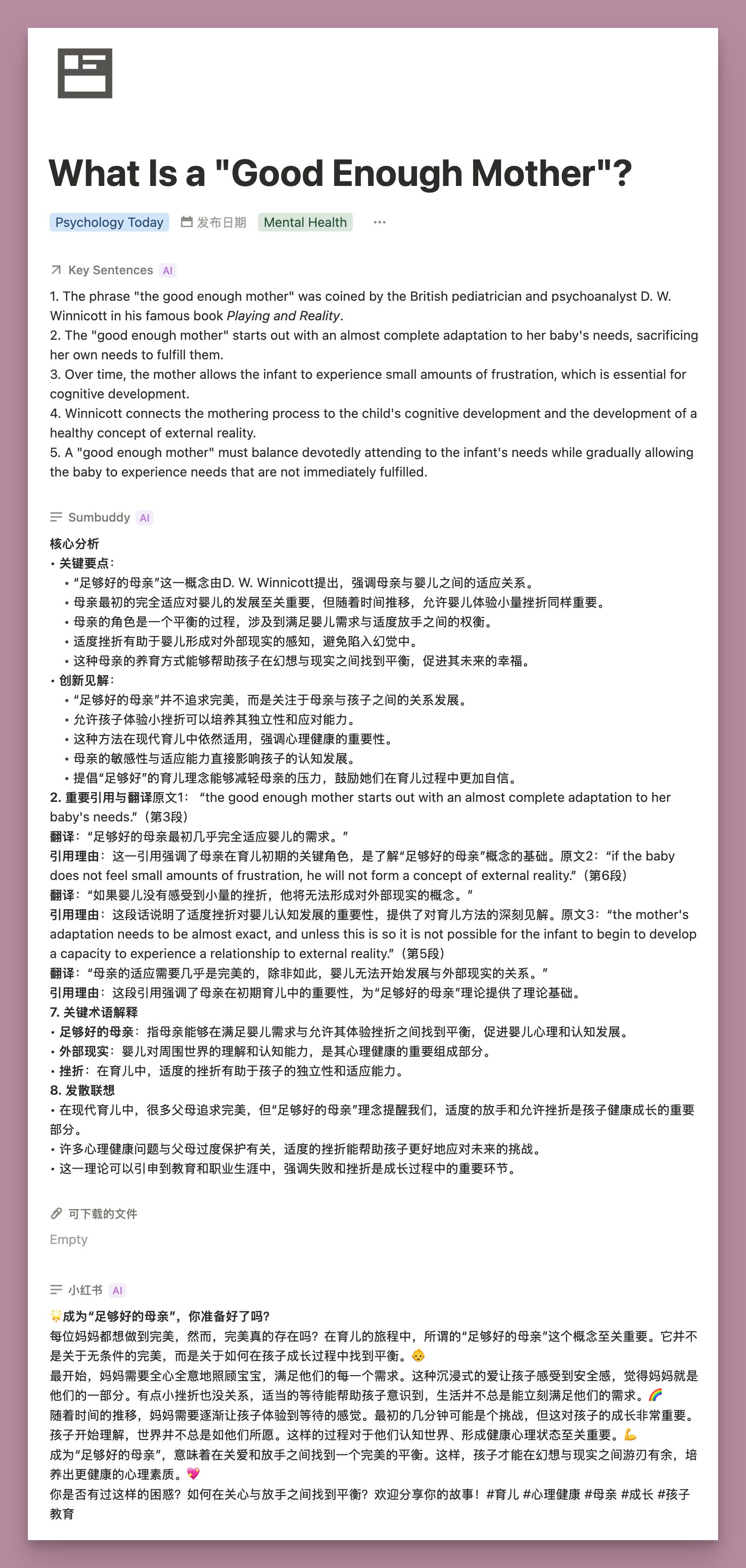 这里简单介绍一下这个模板。后续我会在专栏和会员文章中详细解析模板的思路和 Prompt。这是一个剪藏文章的数据库。使用时,我首先需要提取文章中的关键句子,了解核心思想;然后通过 SumBuddy 分析全文、理解术语。因为我有一个心理学专栏的小红书账号——「重新思考 RE」(虽然基本没怎么运营),所以当时的想法是:收藏文章后,直接生成一篇小红书风格的帖子,可以直接复制粘贴发布,提高账号的运营效率。
