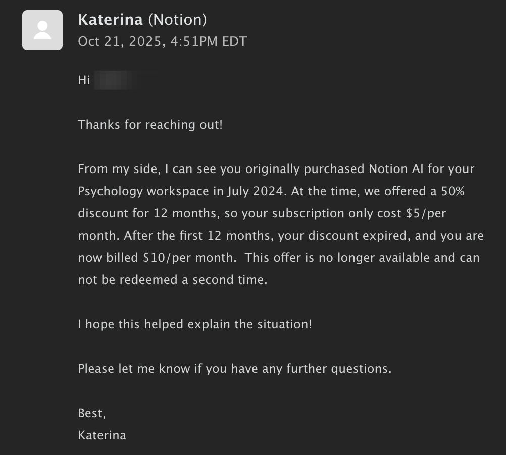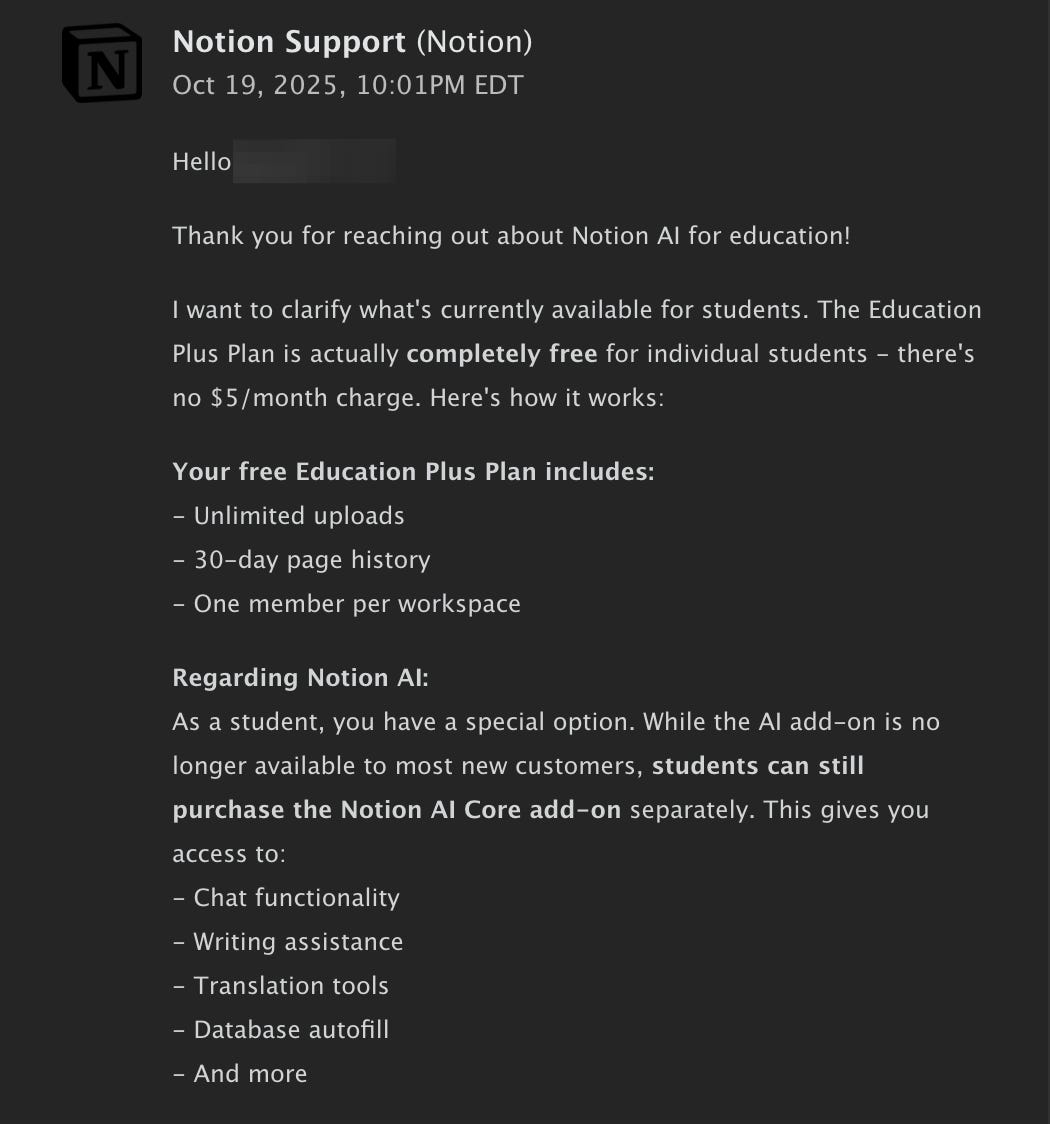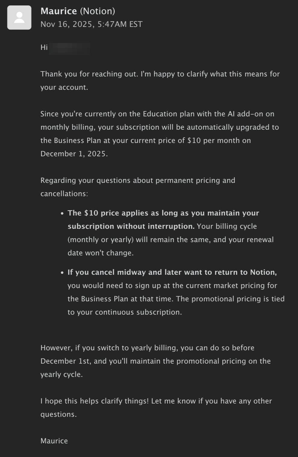 所以,请以 Notion 官方邮件和客服回复为准。如果您不确定自己的权益,建议您发邮件向 Notion 客服咨询。