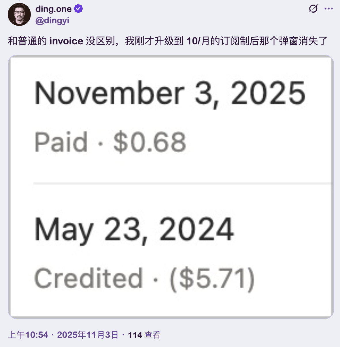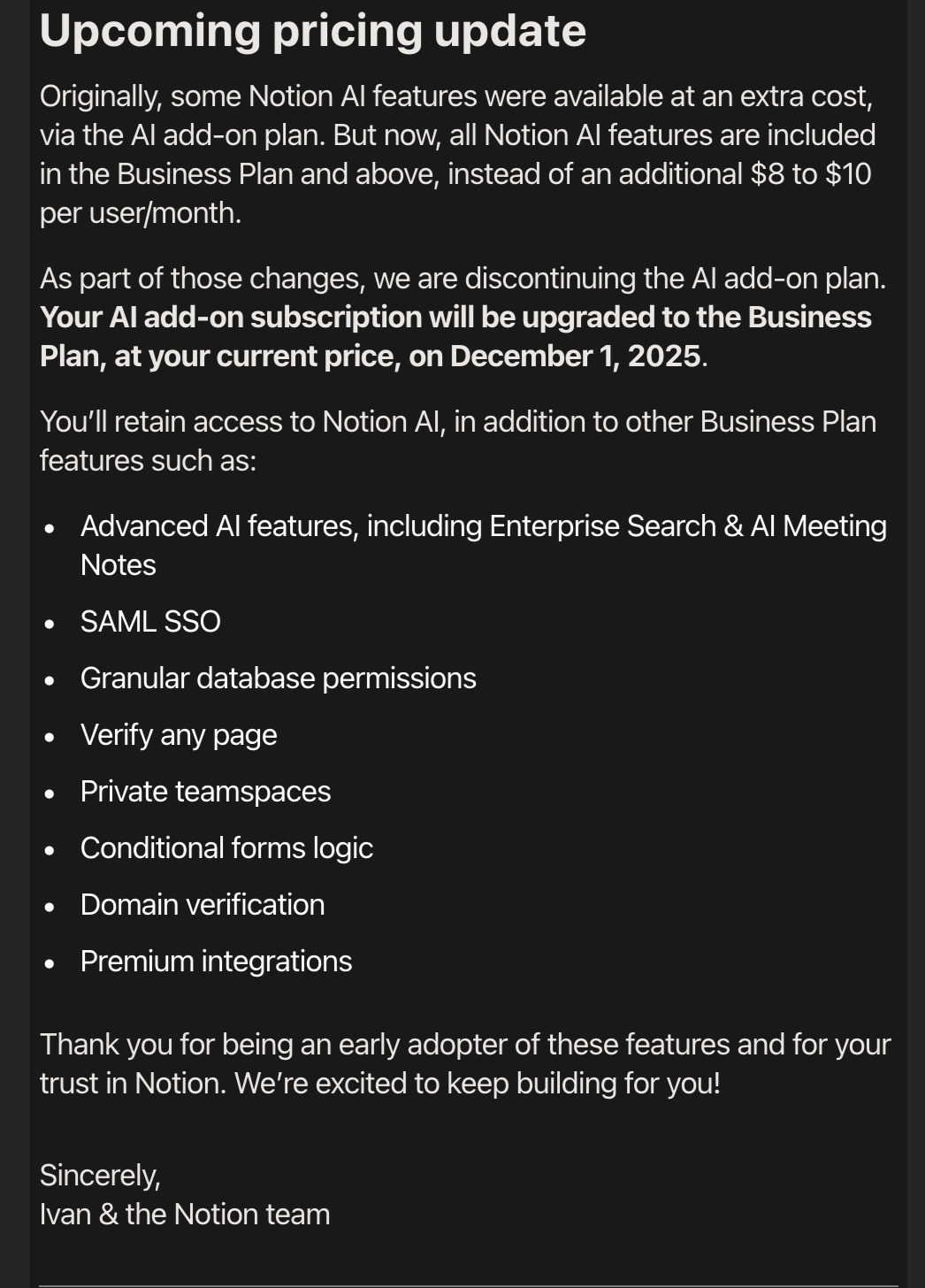 理论上来说,只有收到这封官方邮件的用户才能享受「升舱」服务。许多之前没有订阅 Notion AI 的朋友,或者仍能看到 5 折优惠附加选项的朋友,误以为现在只要订阅 AI,就能在 12 月 1 日之后享受「升舱」服务,这是不正确的。