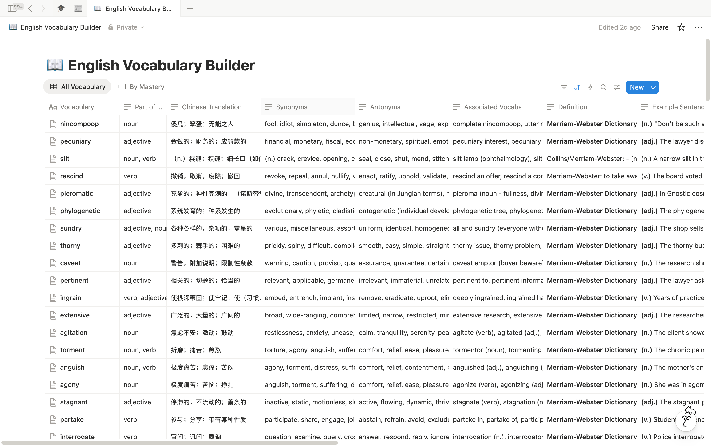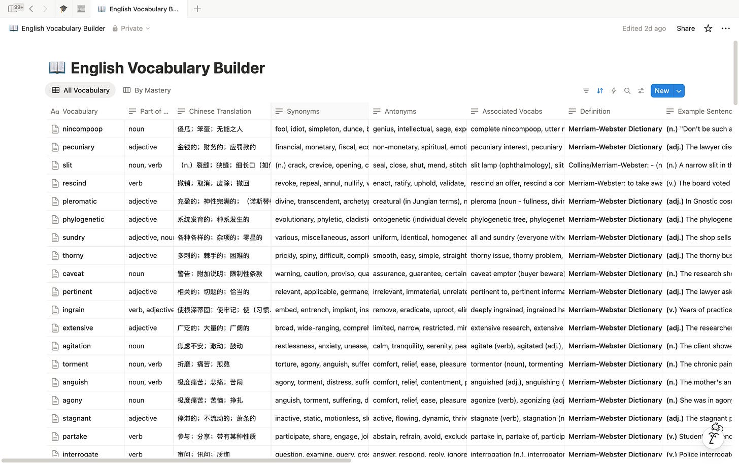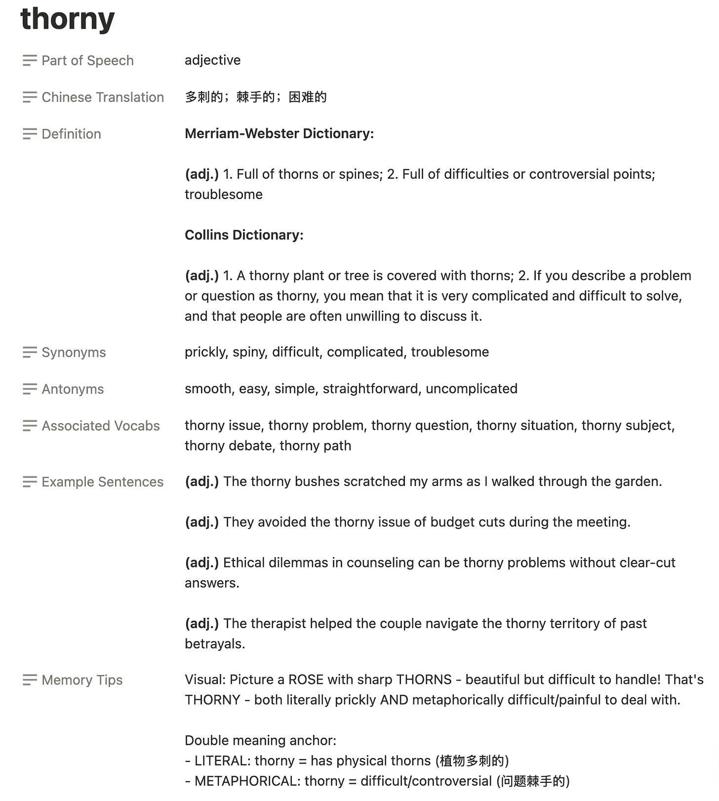 最近,我在 Notion 上制作 LearningOS,一共有 10 颗核心(CORE)。其中之一便是英文单词教练,在实际使用中,非常好用,相比传统地词典,除了能帮助我记忆之外,它更能让我明白不同相近词汇之间的区别以及如何使用不同词性的单词造句。