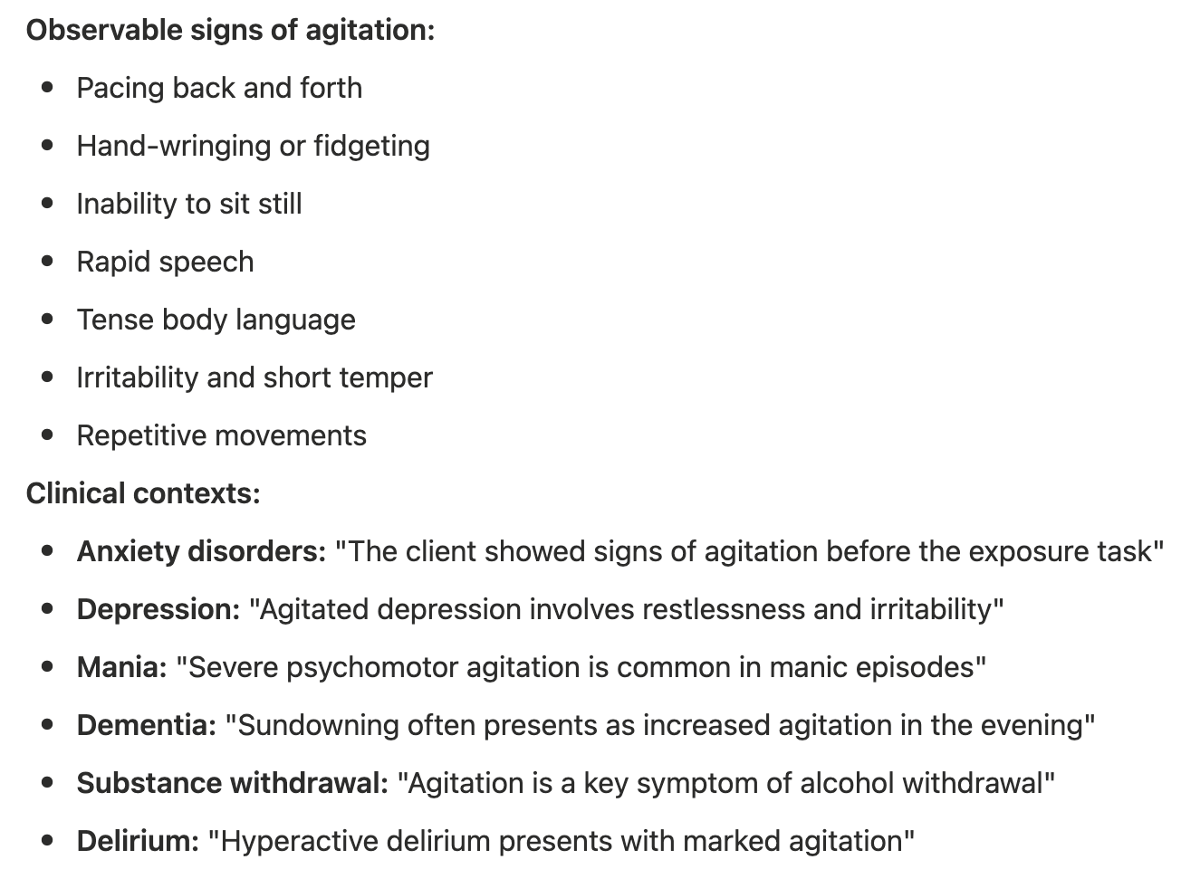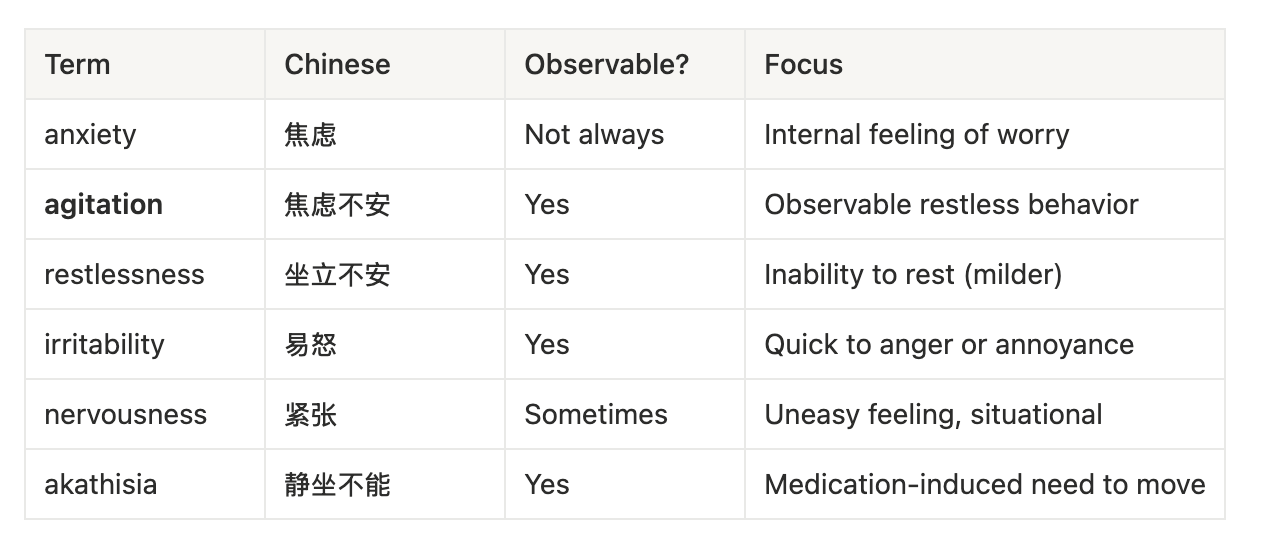 当你在同一聊天界面中查询含义相近的词汇时,AI 会自动生成对比表格,以帮助你更好地理解不同词语之间的区别。例如,agitation 是一个描述患者状态的临床专业术语,其近义词是 restlessness,两者都表示焦虑不安的状态。那么,我们该如何区分并使用它们呢?