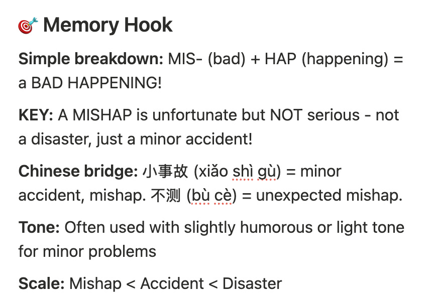 AI 会告诉你单词的严重程度,帮助你排大小。例如,Mishap 的意思是小事故,程度小于「意外」和「灾难」。