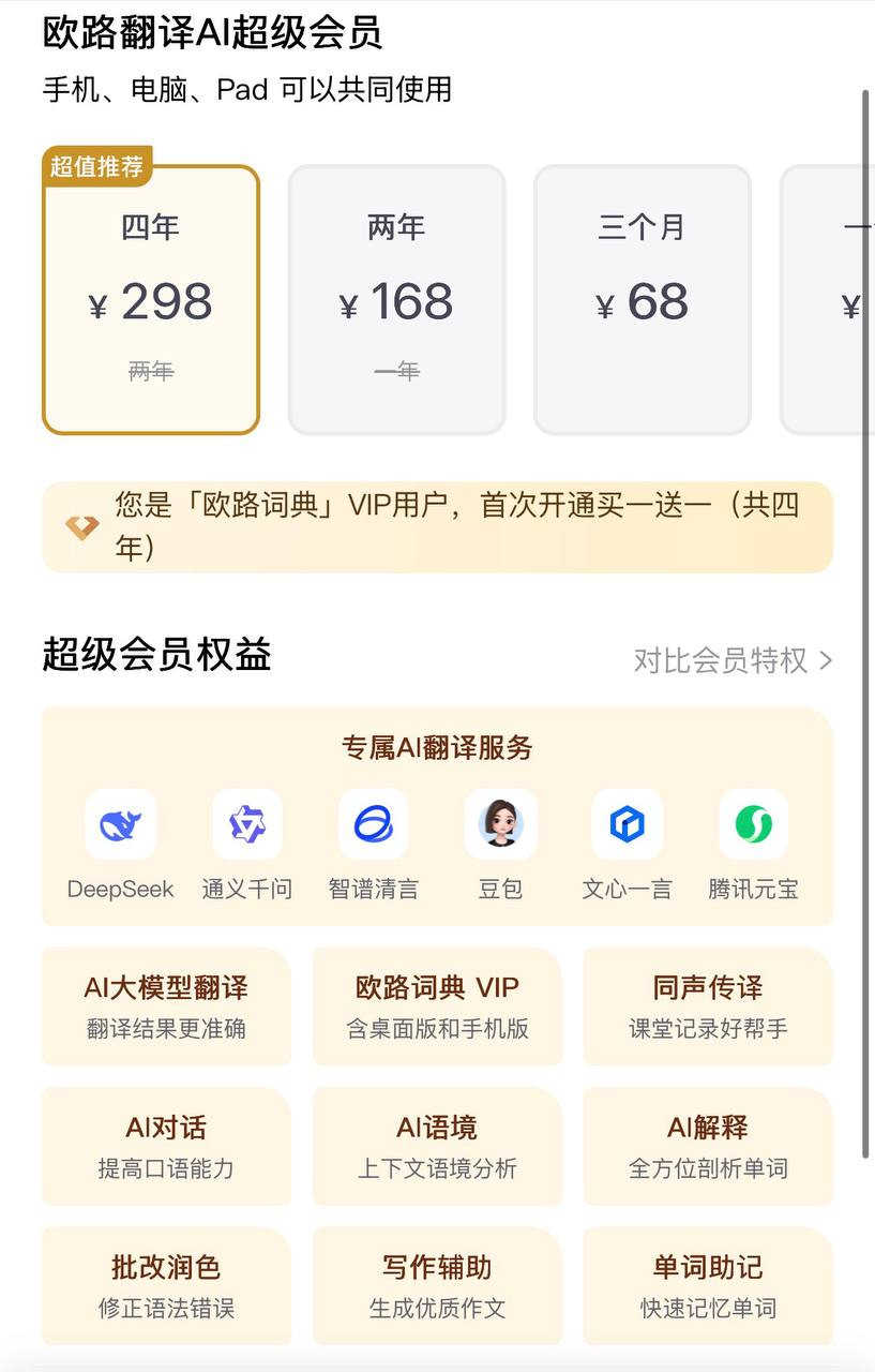 应该是从去年开始,欧路词典加入了 AI 功能。除了最基本的翻译之外,还新增了写作批改和润色;AI 解释、对话、语境等功能。四年 298 元,性价比相当高。它也支持几乎所有国内 AI 大模型的 API,在设置中接入后,即可使用 AI 解释、AI 对话背单词、AI 短文助记等功能,非常实用。
