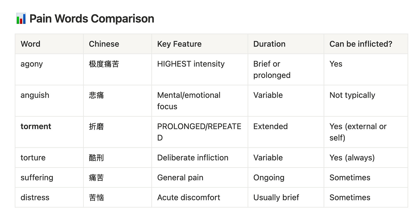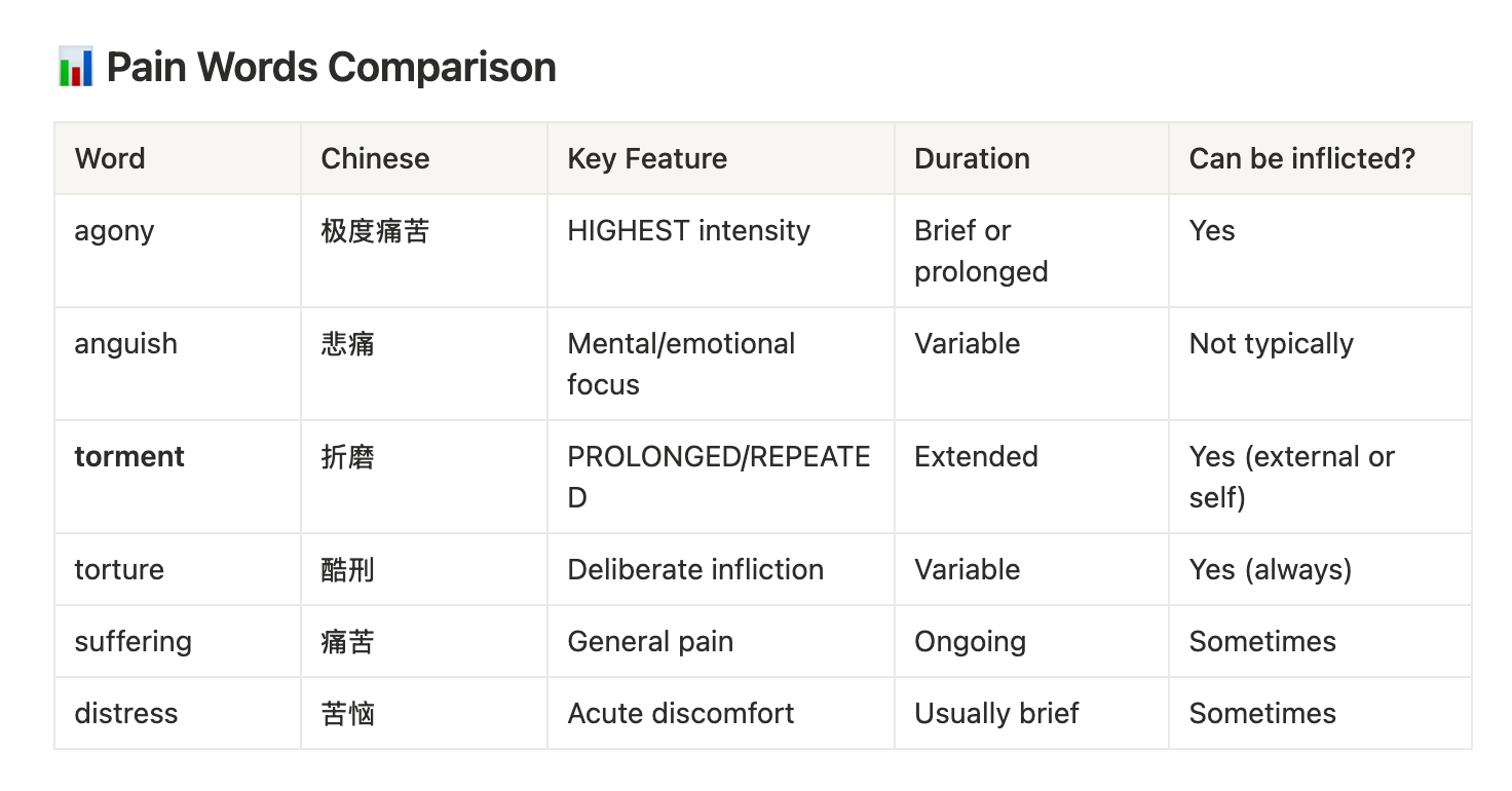 例如,我在一个聊天界面中查询了多个描述痛苦的词汇。一些材料中使用了 agony,另一些则使用了 anguish。在最后一个词汇的页面中,AI 自动生成了这个「痛苦词汇对照表」。