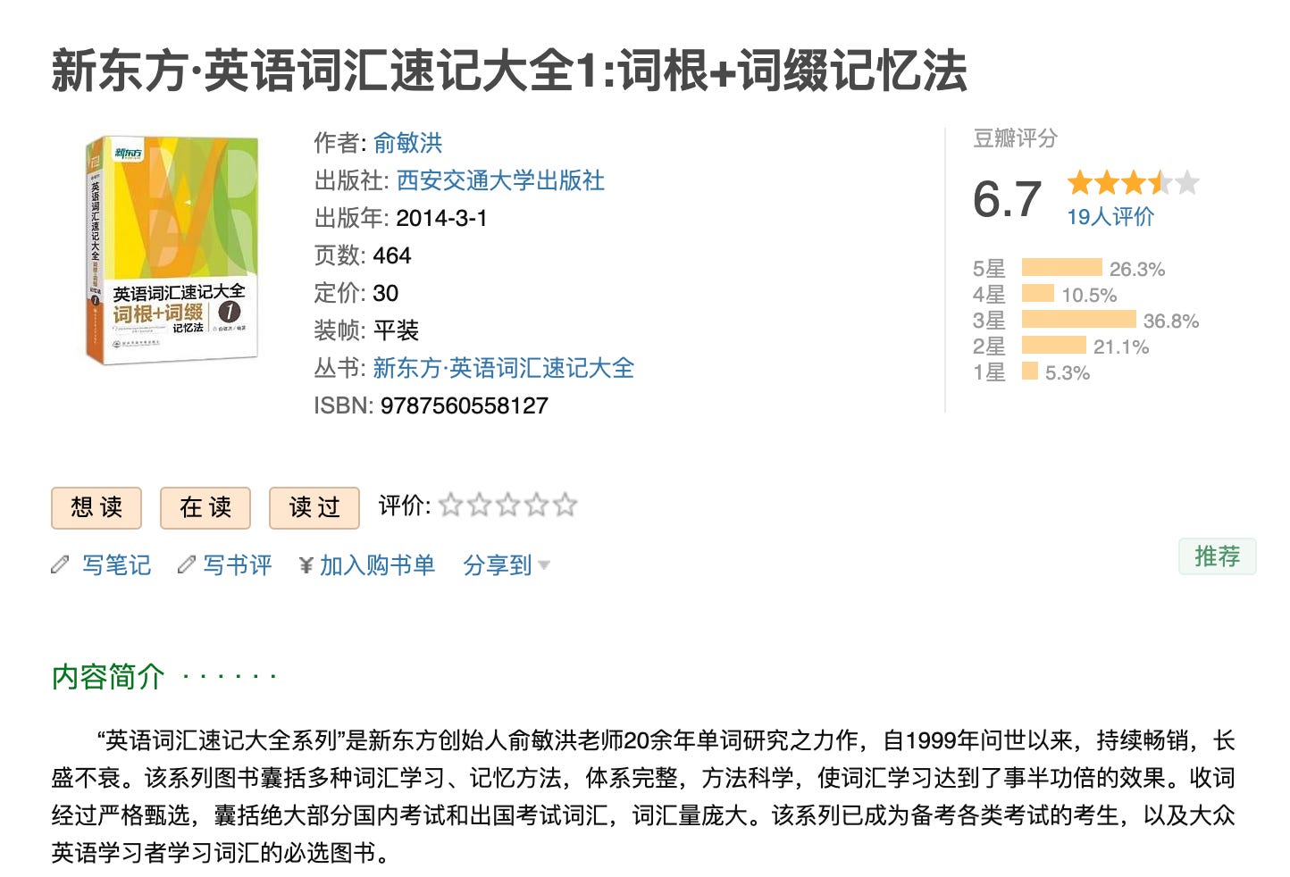 于是,我购买了俞敏洪的这一套《英语词汇速记大全》。这本词根词缀记忆法,受益良多。虽然里面一些联想解释的意思比较奇怪(我也没有读完),但对打好基础,是非常有帮助的。